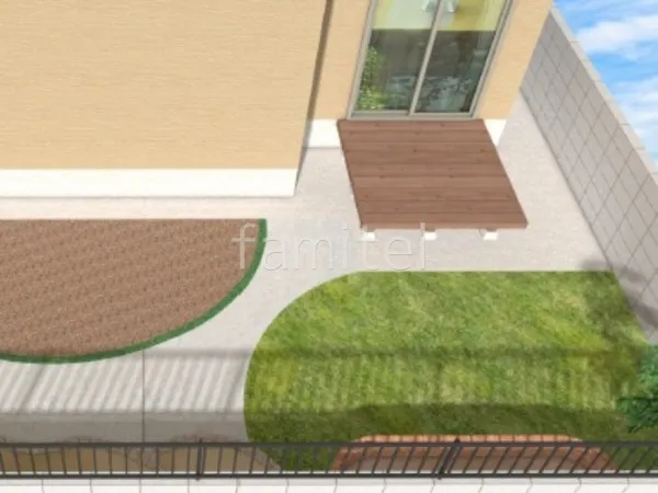 お庭の雑草を丁寧に撤去し、地面を整地して土間を整えた上に緑豊かな天然芝を敷き、滑りにくく風合いのある洗出し仕上げと、耐久性に優れた土間コンクリートを採用し、曲線デザインでナチュラルな印象に仕上げました。 さらに、季節の花々を楽しめる花壇を新設し、お庭に彩りを添えました。