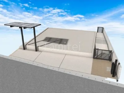 駐輪スペースには敷地形状に合わせて斜めカットしたサイクルポート YKKAP エフルージュFIRSTを設置し、限られたスペースを有効活用しながら自転車の保護空間を確保しました。 エントランスには引き戸門扉 LIXIL アーキスライドA型を採用し、スムーズな開閉と高い防犯性を兼ね備え、宅配ボックス付き機能門柱 LIXIL アクシィ1型を設置することで利便性を向上しました。 また、アプローチには300角タイル LIXIL パセオを採用し、モダンな印象に仕上げました。
