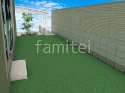お庭の既存の砂利を撤去し、新たに防草シートと人工芝を敷くことで、一年中緑豊かな空間を楽しめる屋外スペースを作りました。 また、境界部分には目隠しフェンス LIXIL AB YL3型を設置し、外部からの視線を遮ることでプライバシーを確保しました。