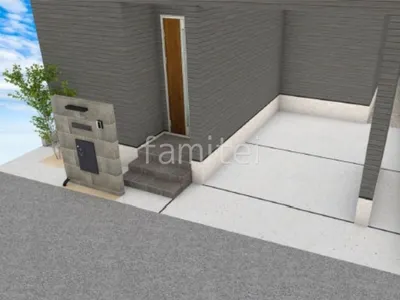 門柱に大判タイル タカショー セラレバンテを貼り仕上げ、上質で重厚感のある玄関まわりを演出しました。 また、シンボルツリーを植栽し、季節ごとの彩りを感じられる空間を創出。 建物周囲には防草シートと砂利を敷くことで、雑草の発生を抑えつつすっきりとした印象で、メンテナンスフリーなスペースに仕上げました。