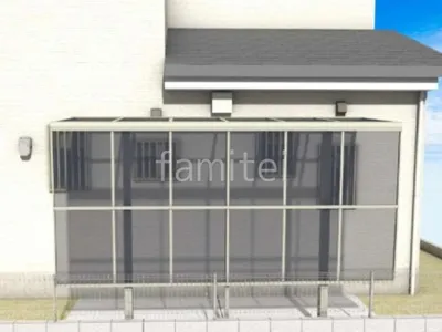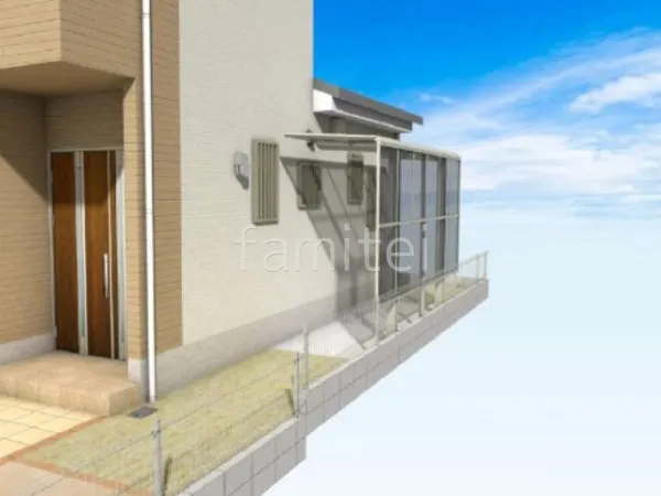 建物横に1階用テラス屋根 LIXIL 独立式フーゴFを設置し、オプションで前面パネルを加えることで雨風をしっかりと防ぎつつ、プライバシーを守ります。 併せて、土間部分の雑草を撤去し、土間コンクリート仕上げにすることで清潔感とメンテナンス性を確保しました。