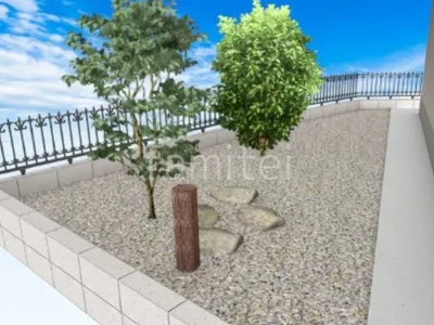 建物周りやお庭の土を丁寧に整地し、全体を防草シートと砂利を敷くことで、雑草の発生を抑え、年間を通じて清潔で管理しやすい環境に仕上げました。 さらに、お庭のシンボルツリーの周囲をレンガで囲い、植栽スペースを明確にすることでデザイン性と機能性を両立しました。