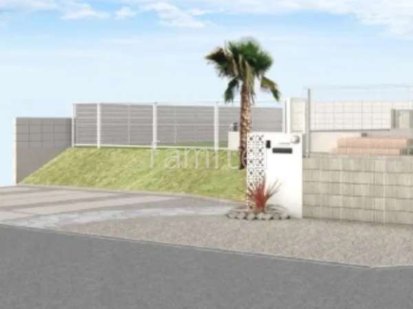 門まわりに塗り壁仕上げの門柱を設置し、ロックガーデンを組み合わせることで、上品な印象を与え、自然との調和が取れたエントランスになりました。 アプローチには乱形石を敷き、スロープ部分は洗出し仕上げを採用することで、個性と美観を両立しました。 お庭にはお手入れが簡単な人工芝を敷き、年間を通して鮮やかな緑を楽しめます。 さらに、目隠しフェンス F&F マイティウッドデコllを設け、プライバシーを守りながら木目調の温かみをプラスしました。
