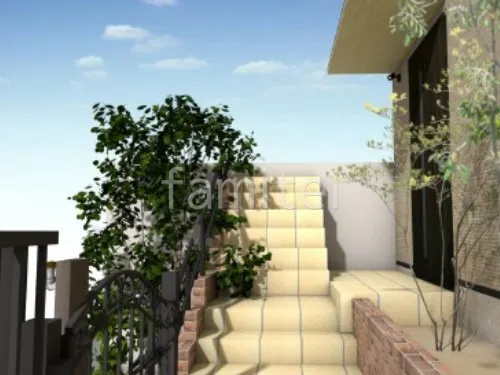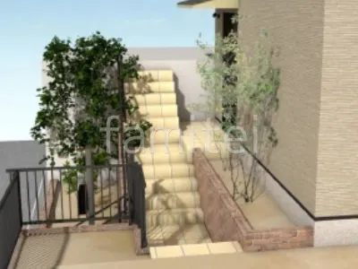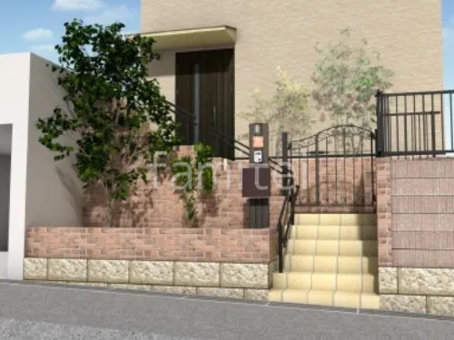既存の花壇植栽を撤去し、空いたスペースに機能門柱 福彫 ボヌールを設置することで、木調の温かみをもたらしつつ利便性の高い門まわりに仕上げました。 門塀にはレンガ風タイル LIXIL ジオクラシコを貼り仕上げ、重厚感と温かみを兼ね備えたクラシカルな印象を演出します。 階段には300角タイル LIXIL ベスパを使用し、高い耐久性と美観を両立させています。