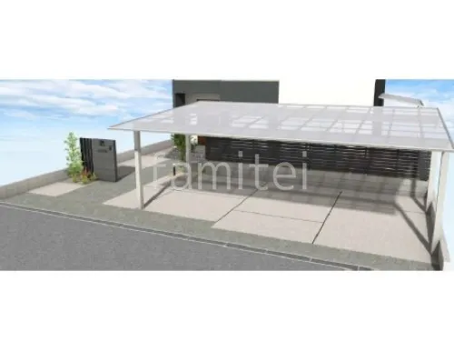 3台用カーポート YKKAP エフルージュFIRSTを設置し、広々とした駐車スペースを確保しながら車をしっかりと保護します。 門柱には細割タイル LIXIL セラヴィオを採用し、上質でモダンな印象を与えています。 アプローチにはグレーの乱形石を敷き、落ち着いた色合いで高級感をプラスします。 お庭には人工芝を敷くことで、メンテナンス性に優れた緑豊かな空間に仕上げました。 さらに、目隠しフェンス LIXIL AB YS3型を配置し、プライバシーを守ります。