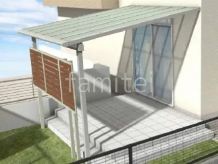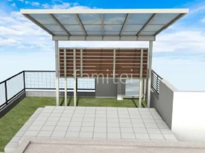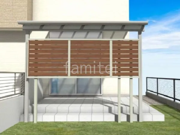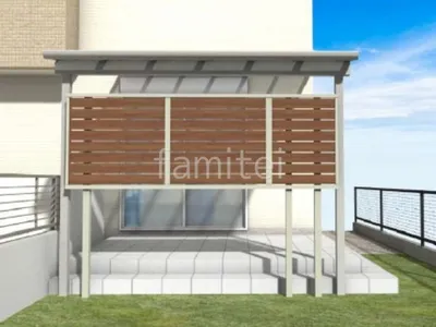 お庭スペースには人工芝を敷き、メンテナンスフリーで年間を通して緑を楽しめる快適な環境を整えました。 既存タイルデッキには1階用テラス屋根 YKKAP ソラリアFを設置し、雨や強い日差しを遮りながら快適に屋外空間を過ごすことができます。 さらに、目隠しフェンス LIXIL 木製調AA YS3型を設け、プライバシーを守りながら温かみのあるデザインを添えました。