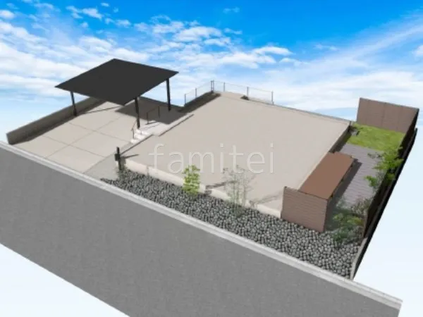 駐車スペースには、屋根材にブラックポリカーボネート材を採用した2台用カーポート YKKAP エフルージュFIRSTを設置し、スタイリッシュなデザインで車を保護します。 お庭には温かみのあるウッドデッキ LIXIL 樹ら楽ステージと、落ち着いた質感の平板 ユニソン リビオを組み合わせ、ゆっくりくつろげるアウトドアリビング空間に仕上げました。 さらに、目隠しフェンス F&F ニコボードを使用することで、お庭スペースのプライバシーをしっかりと確保します。 また、広いロックガーデンスペースを配置することで、四季を通して美しい景観を楽しむことができます。
