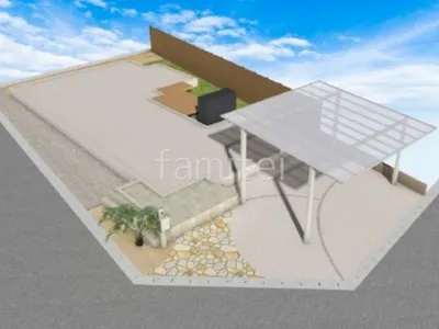 黄色い乱形石で仕上げたアプローチは、自然な風合いと明るい色調が玄関まわりを華やかに演出します。 駐車スペースには2台用カーポート YKKAP エフルージュFIRSTを設置し、雨や日差しから車をしっかり守ります。 お庭にはウッドデッキ LIXIL 樹ら楽ステージと人工芝を組み合わせ、メンテナンスフリーでゆったりとくつろげる空間を作りました。 さらに、目隠しフェンス F&F ニコボードでプライバシーを確保しつつ、木目の温かみをプラスしました。 また、物置 イナバ シンプリー MJX-176Dを配置し、屋外の収納スペースを確保しました。