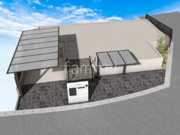 大判タイル LIXIL アヴァンティのタイル門柱を採用し、重厚感のある玄関まわりに仕上げました。 また、1台用カーポートとサイクルポート LIXIL ネスカFを設置することで、雨や日差しから車と自転車をしっかりと守ります。 アプローチには黒の乱形石を採用し、モダンで高級感のある印象をプラスしました。 さらに、目隠しフェンス LIXIL AB YS3型を設け、シンプルなデザインでプライバシーを確保しました。