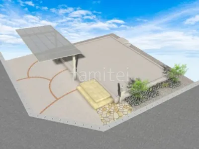 黄色い乱形石を敷いたアプローチが、明るく温かみのあるエントランスを演出します。 門まわりには機能門柱 LIXIL アクシィ1型を設置し、シンプルなデザインで利便性をアップ。 駐車スペースには1台用カーポート LIXIL ネスカFを設置し、フラットなデザインの屋根で車を雨や日差しからしっかり保護します。 さらに、ロックガーデンとシンボルツリーを組み合わせ、自然を感じられるスペースを作りました。