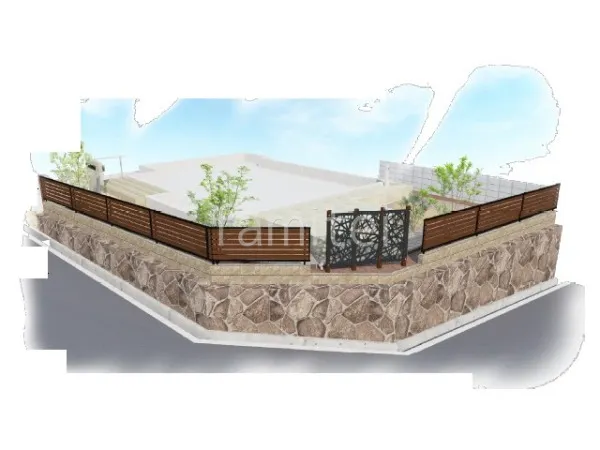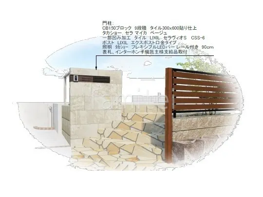 大判タイル タカショー セラマイカを使用したタイル門柱を設け、重厚感と高級感を両立しました。 アプローチには黄色い乱形石を採用し、明るく華やかな印象と自然な温かみをプラスします。 敷地境界には目隠しフェンス YKKAP 木製調シンプレオYS3F型を設置し、プライバシーを確保しながら木目のアクセントを加えました。 さらに、お庭にはタイルデッキを設け、屋外で家族や友人とのくつろぎのスペースを作りました。