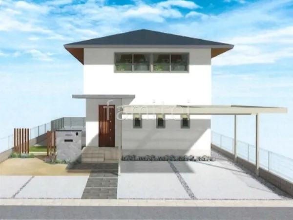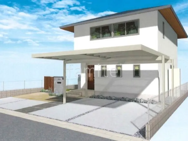 駐車スペースに2台用カーポート 三協アルミ Uスタイルアゼストを設置し、重厚感と高級感のある車庫まわりに仕上げました。 大判タイル タカショー セラレバンテを使用したアプローチと大判タイル タカショー アヴェルサを使用したタイル門柱を組み合わせ、住まいの外観に上質な印象を加えました。