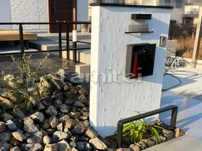 塗り壁門柱 エスケー化研 ベルアート塗装 アルミ笠木 LIXILリクシル コーピング 郵便受けポスト OnlyOneオンリーワン イルブァリオ ピアノ 表札 ローリングヒルズネームプレート SF20 表札灯ライト照明 LPJ-16型 門柱飾り デザイナーズレール