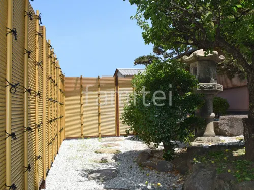 和風目隠し人工竹垣 TAKASHOタカショー こだわり竹イエロー みす垣5型 御所ジャミ 防草シート加工 既存コンクリート撤去