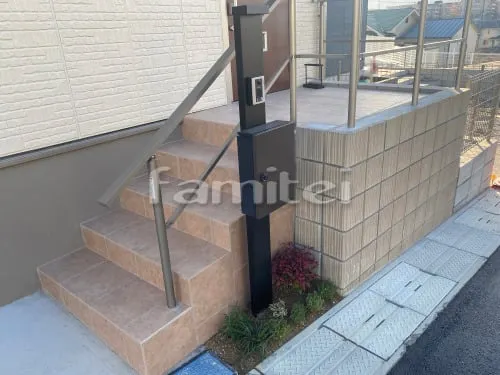 5/28玄関アプローチ階段 床タイル貼り リビエラ 300角 CBブロック積み